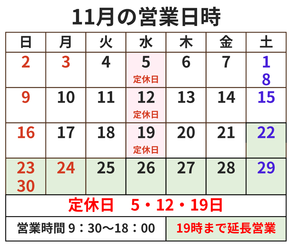 5・12・19日は定休日をいただきます。 22日から12月末まで営業時間を19時まで延長いたします。