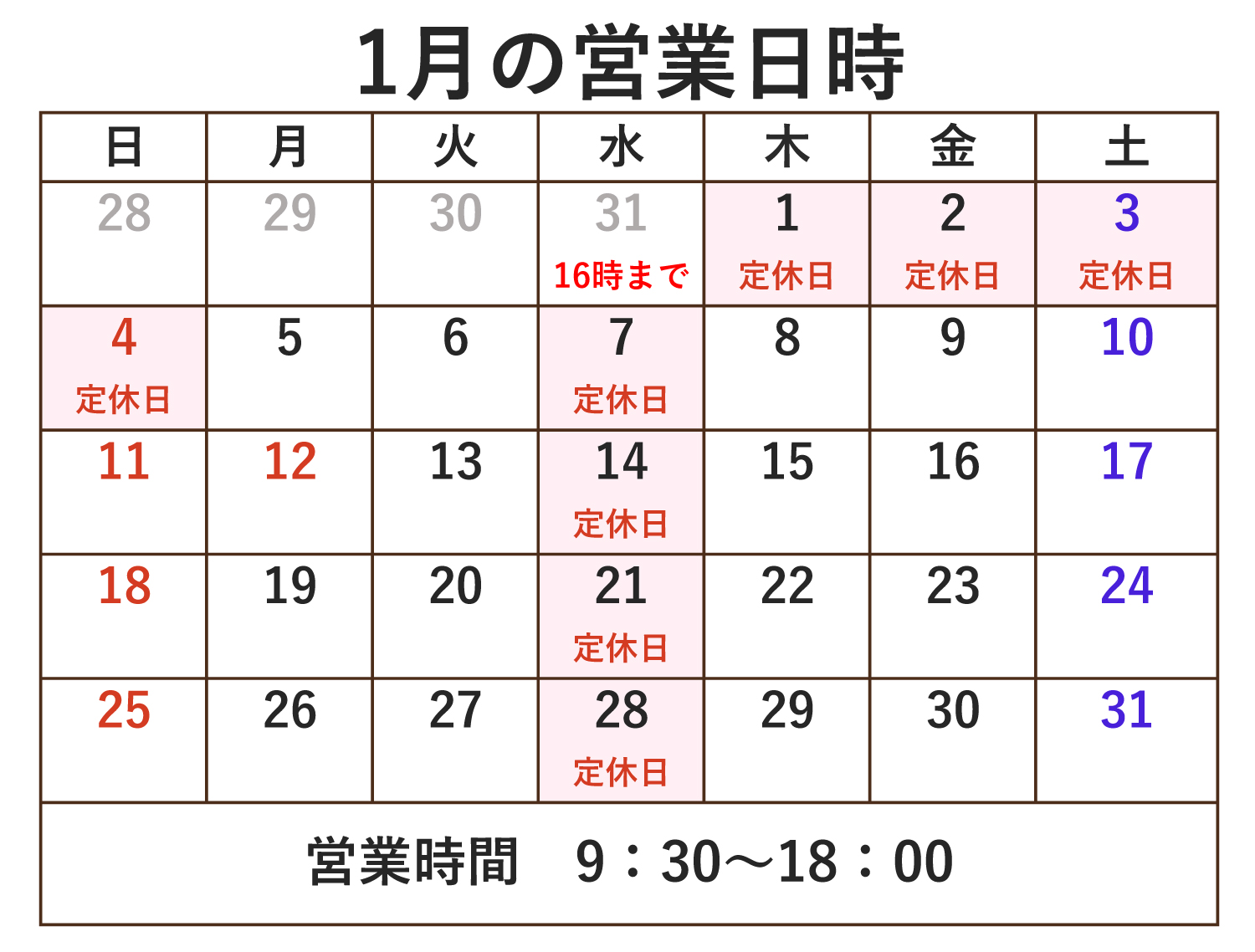 1月より9:30~18:00までの営業時間に戻します。 水曜日は定休日をいただきます。
